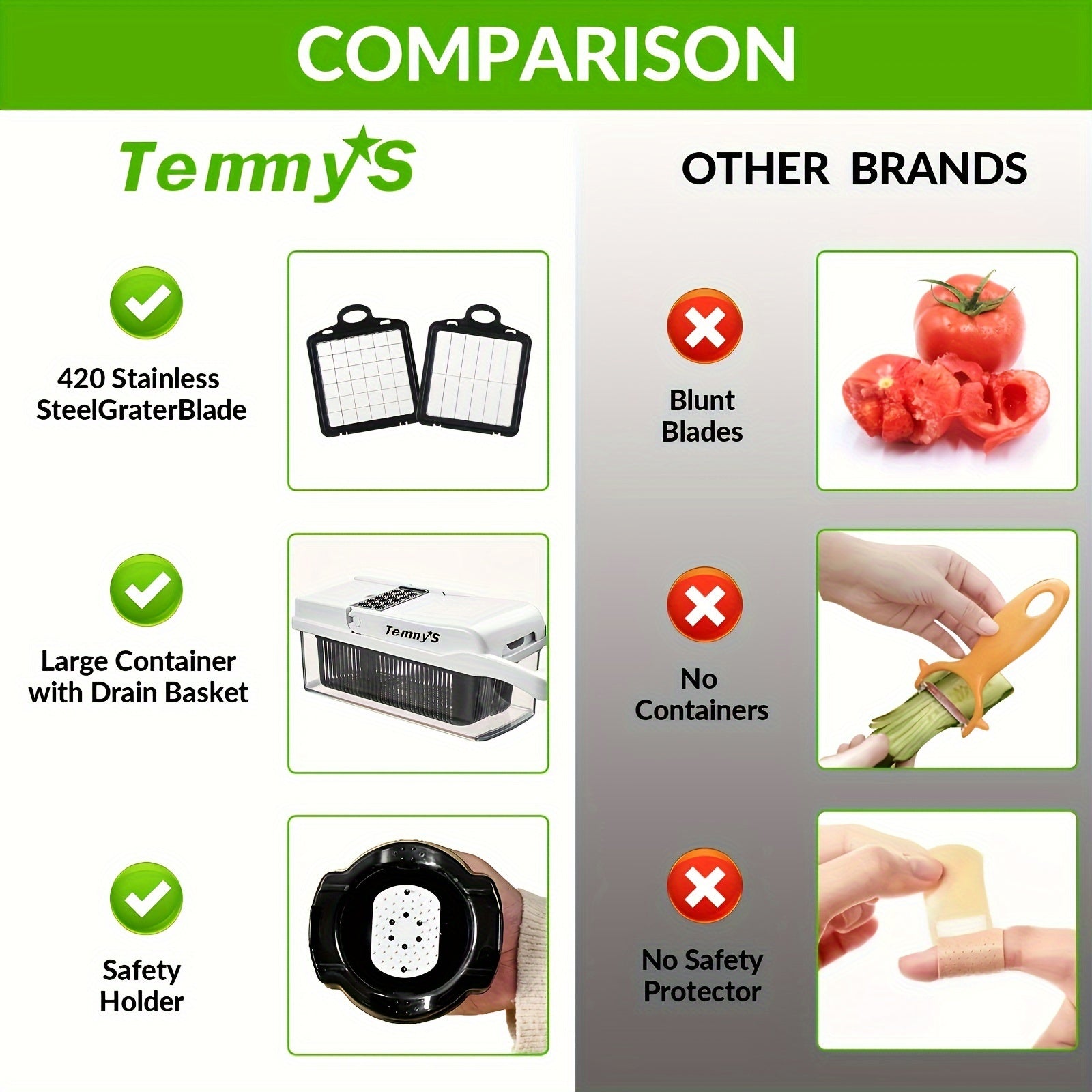 【7 INTERCHANGEABLE BLADES】Vegetable Chopper Slicer contains 420 Premium Stainless steel 7 different sizes of fruit chopper blades interchangeable blades for slicing, dicing or shredding, thick or thin, grinding and chopping. Onion Chopper rust-resistant heavy-duty stainless
